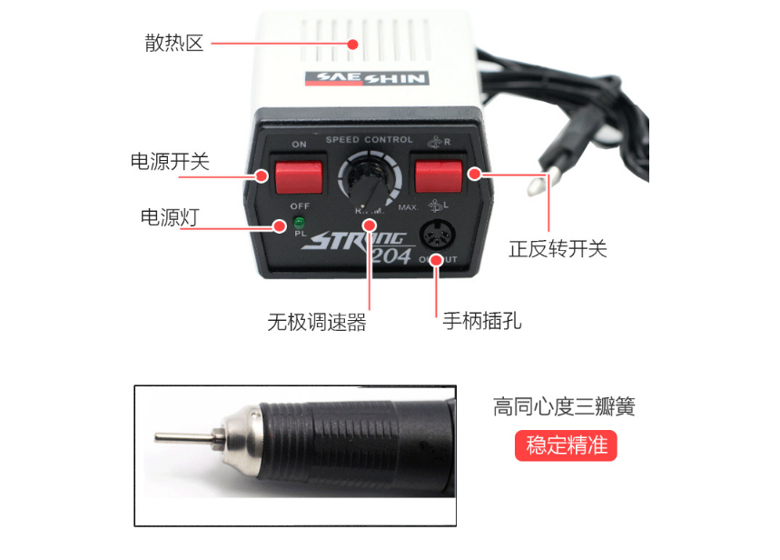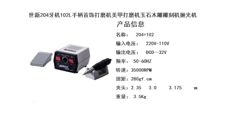 韓國世新204-102L電動打磨機牙機 首飾打磨機 美甲打磨機 玉石雕刻機拋光機,輕便式筆狀結(jié)構(gòu)性設(shè)計,具有小體積,高轉(zhuǎn)速、低噪聲、大力矩、耗氣量低、輕巧平穩(wěn)(抖晃率極低)等特性,其操作簡便、作業(yè)快速方便,廣泛應(yīng)用于各種模具(鞋模、輪胎模、筆模、各類高低壓電器、家用電器模具、塑殼開關(guān)模具等)、五金制品(水龍頭、拉鏈、五金工具及各類成套設(shè)備葙體等)、及玻璃、石材、工藝品、手飾、線路板制造等等一切需要毛坯修整、切削、研磨、雕刻、修整、及需鏡面拋光作業(yè)的行業(yè)。