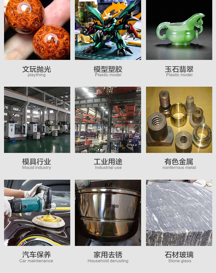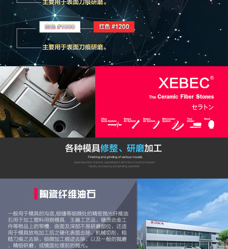 6、除可用于手持研磨外,且適用于氣動、電動往復(fù)式研磨機(jī)。在超音波振動研磨機(jī)上使用,效果最佳(與研磨面保持45度角使用)。陶瓷纖維油石可在各種不同材質(zhì)的模具鋼上研磨加工。最適用于一般難研磨加工處,如窄溝壁、溝底、孔、滑痕、肋部及微小精細(xì)處。尤其對于放電加工后積碳層的快速去除及拋光效果更佳。