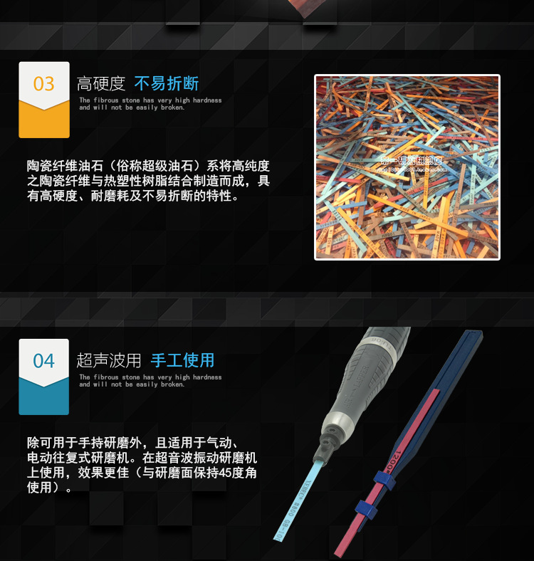 5、也叫陶瓷纖維油石(俗稱超級油石)系將高純度之陶瓷纖維與熱塑性樹脂結(jié)合制造而成,具有高硬度、耐磨耗及不易折斷的特性。