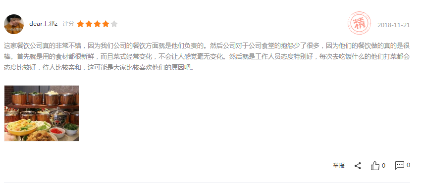 一個(gè)好的食堂承包公司要想打造品牌餐飲,樹立行業(yè)典范!一定在做好菜品方面的同時(shí),服務(wù)方面也應(yīng)該與時(shí)俱進(jìn)!以下截屏是客戶的真實(shí)評價(jià):