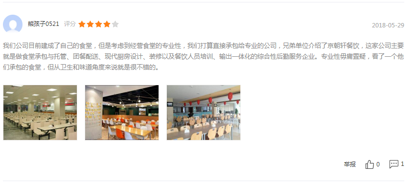 ? ? ? ?北京京朝軒餐飲管理有限公司近幾年在食堂運(yùn)營口碑方面得到了許多客戶的認(rèn)可,同時(shí)我司也奉行“微利經(jīng)營,長足發(fā)展”的經(jīng)營宗旨,能讓客戶得到實(shí)惠,達(dá)到雙贏。以下截屏是客戶的真實(shí)評價(jià):