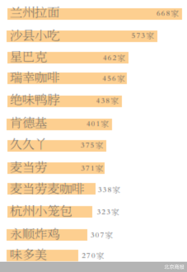 ■ 北京餐飲品牌門店數(shù)排名與北京餐飲各品類占比相契合,以蘭州拉面、沙縣小吃等為代表的快餐簡餐門店規(guī)模排名前列。另外,星巴克、瑞幸咖啡等飲品品牌門店規(guī)模僅隨其后,這也與北京作為國際消費(fèi)中心城市,將其市場作為主要發(fā)力點(diǎn)有一定關(guān)系。